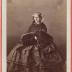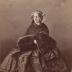 Full-length photograph of a middle-aged woman sitting in a crinoline dress with three level skirt, wearing a jacket and a large fur muff. Her hair is in fashionable style, with two scrolled braids from both sides of the face, and a ruffled bonnet hat.