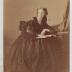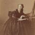 Full-length photograph of a young woman known as Sophie TROUBETSKOY (1836 - 1898), Russian princess, married to Charles de MORNY (count and further Duke), half-brother of Napoleon III. The noble lady is posing sitting in a chair at the table with a book, and looking on the side. She is wearing a crinoline mourning dress with a dark Chantilly lace matte silk shawl.