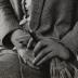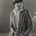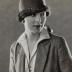 Paper photograph depicting a half portrait of a woman wearing a tweed suit consisting of a jacket and a skirt, light satin shirt and a cloche hat. She is holding an umbrella with her left hand near the knees.
