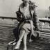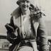 Paper photograph depicting a woman known as Marceline d'ALROY of Paris, a feature writer and fashion expert, who came to New York to lecture on the psychology of fashion. She is wearing a coat over a skirt suit, adorned with lily of the valley bouquet on the collar.
