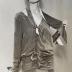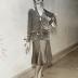 Paper photograph depicting a woman wearing a fashionable silky knee-length dress with a scarf type collar, long sleeves and a metal buckle on the belt. The model is wearing a pair of low heel shoes.