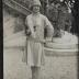 Paper photograph depicting a woman, probably at the horse racing, in a knee length silky gown with long sleeves and tiny embroideries on the upper part, embellished with pearls. The model is wearing a cloche hat, a long pearl necklace, and holding a clutch bag.