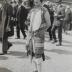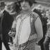 Paper photograph depicting a woman at the horse racing, in a knee length Oriental inspired gown with short sleeves and Arabic ornaments. The model is wearing a hat with a feather, and holding a clutch bag.