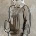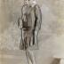 Paper photograph depicting a woman in a knee length gown with long sleeves, velvet cuffs and flounce on the skirt, with a large belt decorated with a rectangular rhinestone buckle. The model is wearing a cloche hat, a short pearl necklace and holding a clutch.