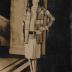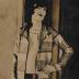 Paper photograph depicting a woman, wearing a dress costume with jacket, with tartan-banded design and a wide belt with two small rhinestone buckles.