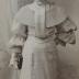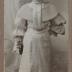 Boudoir format photograph depicting a young woman wearing a light colour gown, probably in brocade, with pleated shoulder and cuffs. The dress has a high collar and is adorned with a brooch.