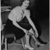 Paper photograph depicting Missis Bess M. HEDGE of Oklahoma city, prolific woman inventor, putting on her stocking raincoat, one of 58 of her inventions, and shown at the Inventors' Congress.