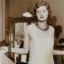 Paper photograph depicting a young woman modeling in an attractive evening gown in white embroidered bodice and skirt of heavy tulle. She is wearing an Art Deco set of jewellery, consisting of a necklace and a bracelet of long rectangular two coloured glass parts.