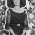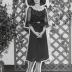 Paper photograph depicting a young woman modeling in an elbow sleeved black and blue chiffon dress with a belt adorned with a two part rhinestone buckle. She is wearing a two strand short pearl necklace and a thin bracelet.
