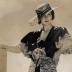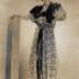 Paper photograph depicting a young woman modeling in a long evening gown with machine lace skirt and sleeves, and a large flower on the waist. She is wearing a wide straw hat, and leaning on a rectangular column.