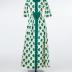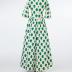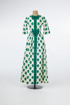 Printed cotton hostess gown with repeating green abstract devices on white pique with elbow length sleeve, set-in waist and full skirt having side pockets, trimmed in green grosgrain ribbon.
