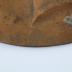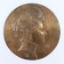 Decorative brass or copper wall plate in repoussé technique representing an embossed woman's portrait with an updo bun hairstyle and high collar shirt.