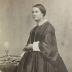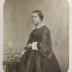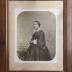 Framed photographic portrait of a three-quarter-length woman next to a table on which is a bouquet holder vase. She is wearing a crinoline dress in silk moire, embellished with engagente and a small crochet collar. She wears jewelry (brooch, earring and ring) as well as a pair of glasses hanging from a chain.
