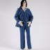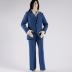 Steel-colored polyester / wool three-piece men's suit, has fitted single-breasted jacket with wide peaked lapels and three flap pockets, that lined with grey silk; matching waistcoat with rayon satin back; low-rise slightly flared trousers.