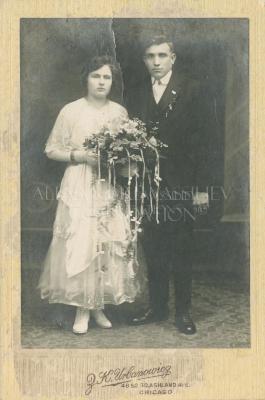 Cabinet photography of a couple who participate in a wedding party: a young girl with a bunch of flowers in the left hand and a man in a dark suit. Attached to matted beige cardboard.