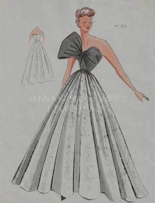 Fashion drawing, in pencil and gouache on grey paper, representing a woman wearing a long New Look style ball gown in A-line of silver colour, with a heart shape strapless bodice representing a large stylized bow, and a pleated skirt. The colour of the bodice is darker that the skirt. On the left there is a small sketch of the back of the dress. The drawing is numbered on the top "139".