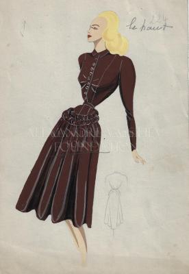 Fashion drawing, in pencil and gouache on embossed paper, representing a woman wearing an ankle-length brown colour A-line dress with high neck with small V collar, and long sleeves. Two fold flounce covers the hips under the tight waistline of the pleated skirt. On the right there is a small sketch of the back of the dress. The drawing is numbered on the top "224".