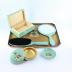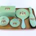 Hairdressing set in blue lacquered wood consisting of a tray, a hand mirror, a hairbrush, a jewelry box, a powder box and a dish, all decorated with a coat of arms.