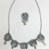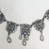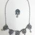 Set of jewellery consisting of a necklace and one ear clip (the other is missing). The necklace is featuring silver-tone metal chain and a set of five linked silver-tone metal panels in decorative design, embellished with iridescent rhinestones around three tiny pearls in the center, and tear and round shaped pearl pendants. The clip has the same design.