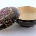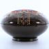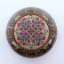 Large and high round box in wood, handpainted and carved on the top with a traditional Russian art inspired design forming a frame around a round canvas in the center with a cross stitch embroidery in blue and red. The case is signed by the Russian emigrant artist.