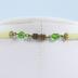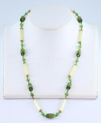 Art Deco style medium long necklace in faceted green glass beads surrounded by a chiseled brass ring, and cylinder shaped long pale green beads with mother of pearl glance.