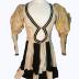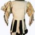 Theater costume with flared neckline and fitted at the waist in the Renaissance style, made of woolen cloth, black silk velvet and brocaded silk, adorned with metallic thread embroidery on the sleeves with decorative motifs.