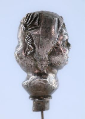 Cane pommel covered with silver-plated metal sheet, chiseled with Janusian cherub heads, inspired by the revival interest in Versailles, with their hair hiden under a bonnet, each with different side decoration.