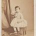Photographic portrait of a young child seated and lean on a smoking chair his feet are posing on a footstool. He wears a woolen suit consisting of a skirt and a caracot.